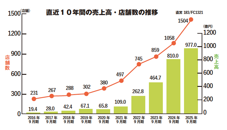 いらないモノを売るという行動が、キレイごとでも贅沢でもなく、「生活を守るための手段」になったのだと感じています。この結果、リユース市場が大きく伸び、その中でも「買取大吉」は圧倒的な伸び率を誇っています。直近の店舗数は、直営店187店舗、FC1436店舗の計1623店舗(12月2日時点)です。これだけ店舗数が増えても、現在も加盟ベースで、毎月70店舗増加しています。